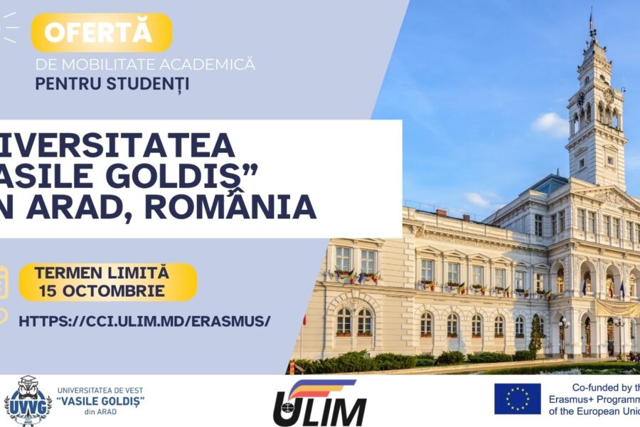 Universitatea Liberă Internațională din Moldova anunță organizarea concursului de selecție a candidaților pentru mobilitate academică la instituția parteneră Erasmus+ 𝐔𝐧𝐢𝐯𝐞𝐫𝐬𝐢𝐭𝐚𝐭𝐞𝐚 "𝐕𝐚𝐬𝐢𝐥𝐞 𝐆𝐨𝐥𝐝𝐢ş" 𝐝𝐢𝐧 𝐀𝐫𝐚𝐝, 𝐑𝐨𝐦â𝐧𝐢𝐚 care…