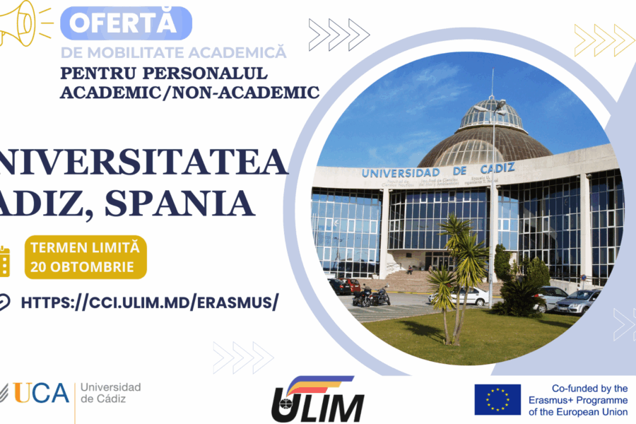 Universitatea Liberă Internațională din Moldova anunță organizarea concursului de selecție a candidaților pentru mobilitate academică la instituția parteneră Erasmus+ Universitatea Cadiz din Spania, care oferă burse de…